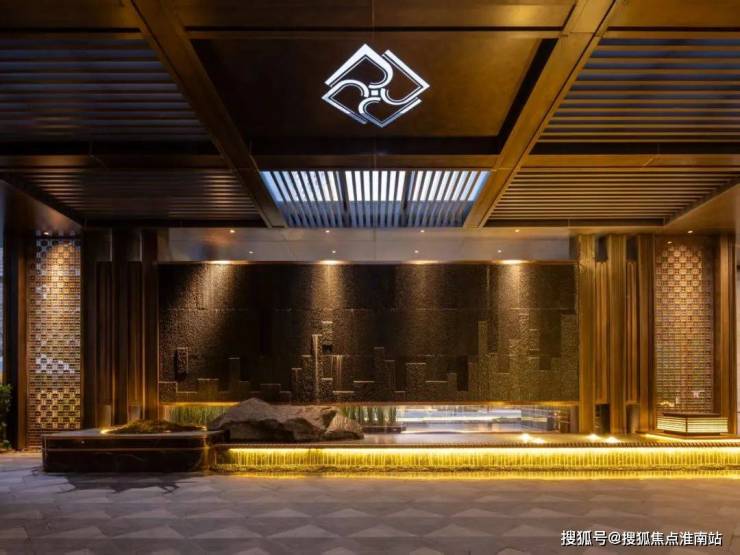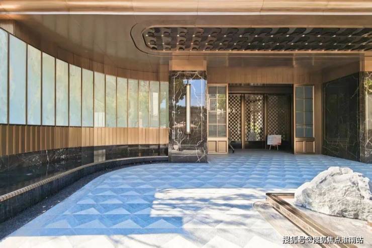 门庭内更是别有洞天,「水韵莲径」架空走廊以石材景墙与金属格栅构成曲径通幽的通道,阳光穿过镂空莲花雕花在地面投射出斑驳莲影,极具东方意韵。