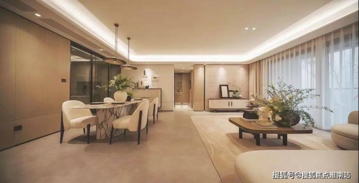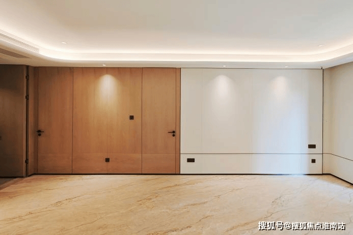 设计审美也进化了,所有门都做到通顶高度,采用隐藏门设计增强空间美学的一体化;客厅通铺大面积简一瓷砖,弧形吊顶提升了空间的质感,实体交标样板间看起来品质感非常棒。