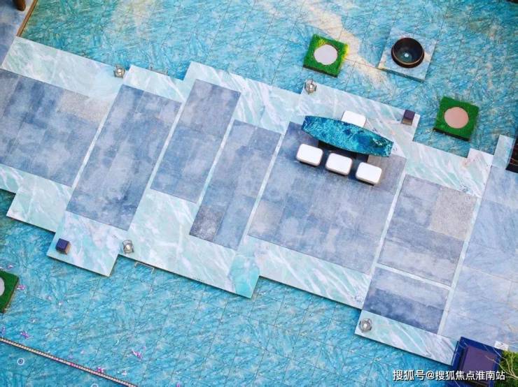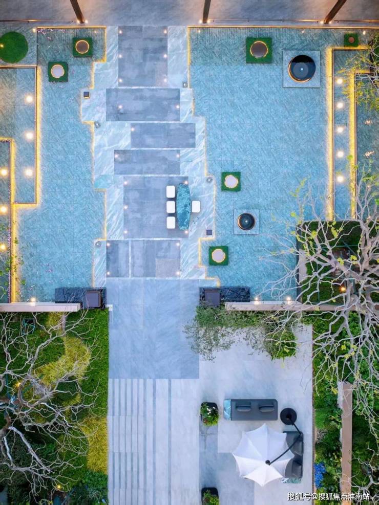 镜面水池倒映出天空与建筑,叠水瀑布形成动态的水流韵律,莲花雕塑在阳光下映衬出斑驳树影,池畔还有大理石打造的休憩长桌,成为被绿意环抱的林下空间,营造出坐看云起时的禅意氛围。