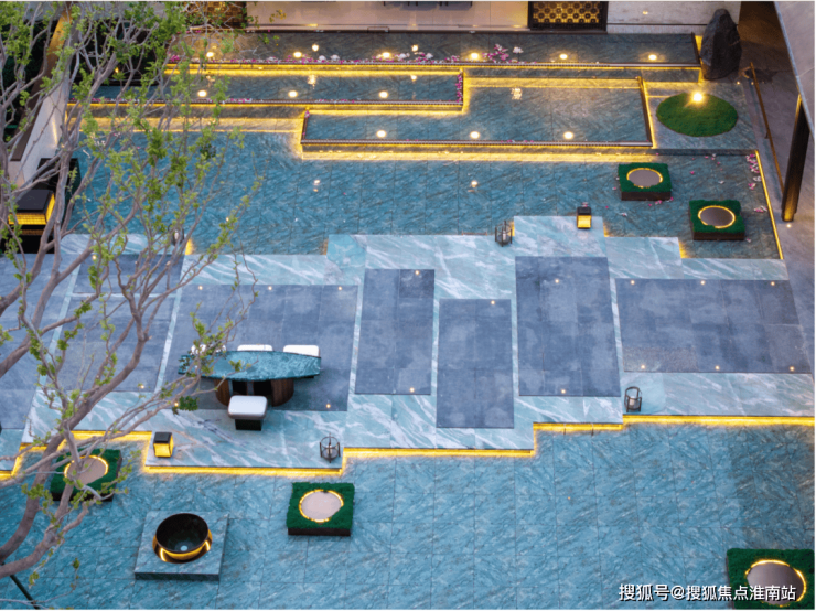 中央水韵庭院是整个社区灵魂所在,设计师以「叠水莲池」为理念打造多层次的水景体系。