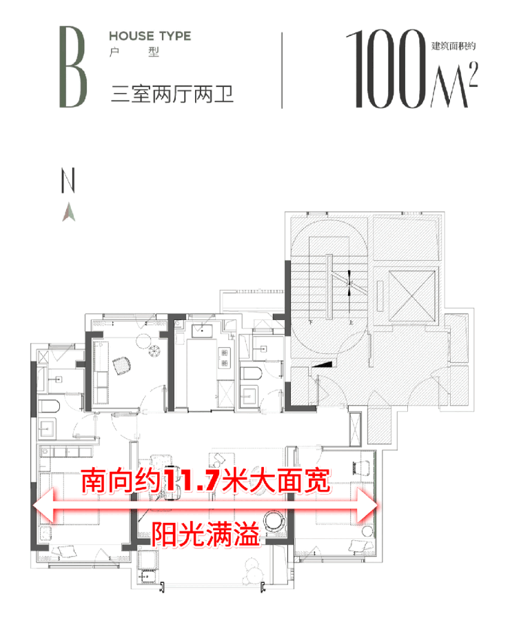 建面约100㎡横厅户型做到「采光最大化」。惊人的约11.7米南向整体面宽,足以让阳光洒满整个屋内。