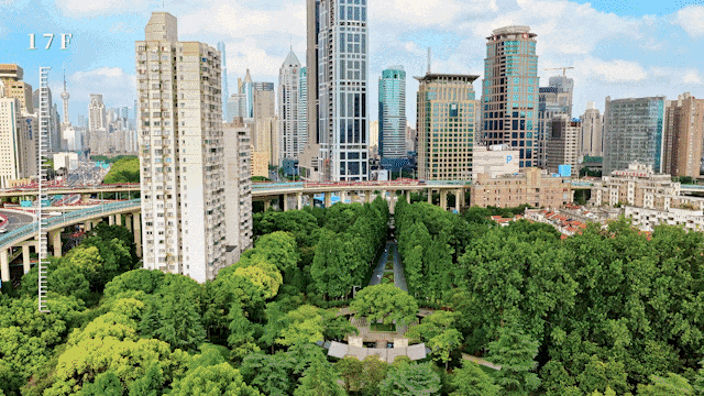 东向,脚下是占地约26万方的城市公园-延中绿地,远眺是陆家嘴三件套以无遮挡的姿态矗立于天际;