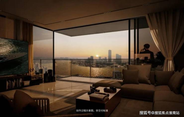 项目的滨江大户型,以无界平层结构,配合3.3米层高(部分)和全景落地窗打造270°环幕江景舱,实现上海滨江市场罕见的IMAX环幕江景视野。