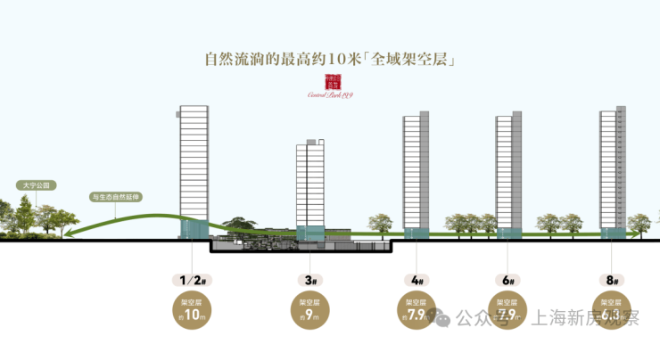 为了最大化内外景观视野,整个社区规划了行业标准内出挑的一层架空层,最高的10米,主体7.9-9米,最矮的也有6.3米。