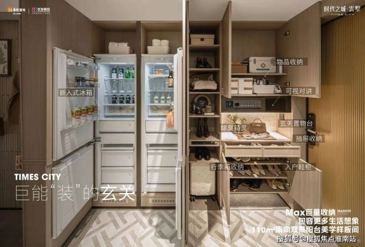 其 全屋收纳系统尤为突出!U型厨房采用半开放式设计, “分层调味架、下拉篮及踢脚抽”实现高效收纳;
