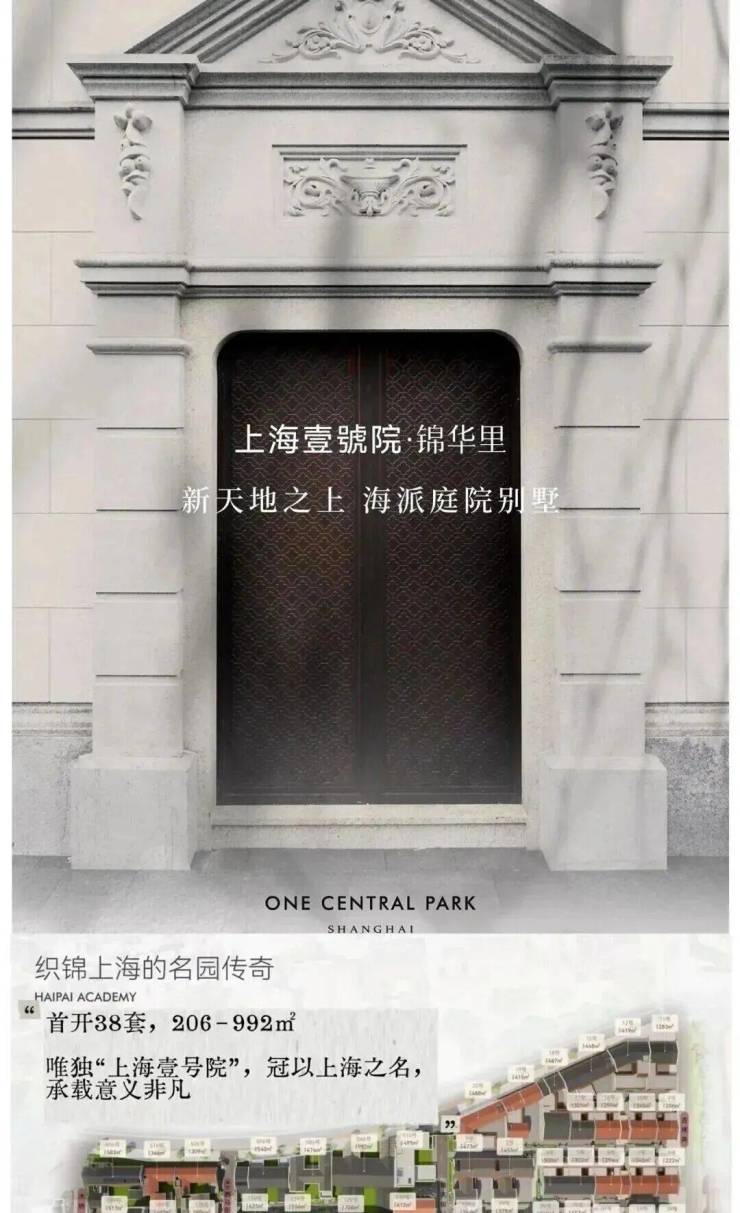 上海壹号院风貌合院别墅【体量】151套风貌【本批次】第一批次,38套,分3个组团【类型】纯合院风貌(毛坯交付)【面积】206平-992平(主力户型415--612平)【均价】30万+,套均过亿【户型】每套不同,107个户型(1字型、回字形、C字形、L型、H型……)【风格】江南园邸、现代主义、街店式、近代装饰……多类型供选择【层高】3.9/3.6/3.6(大户型为主)3.6/3.3/3.3(小户型为主)【赠送】花园、阳台、双露台、大面积地下室、阁楼闷顶高度不一【巷道】组团,支巷道3米-4.5米【物业】融创(地上19.8元,地下9.9元)上海壹号院风貌合院别墅