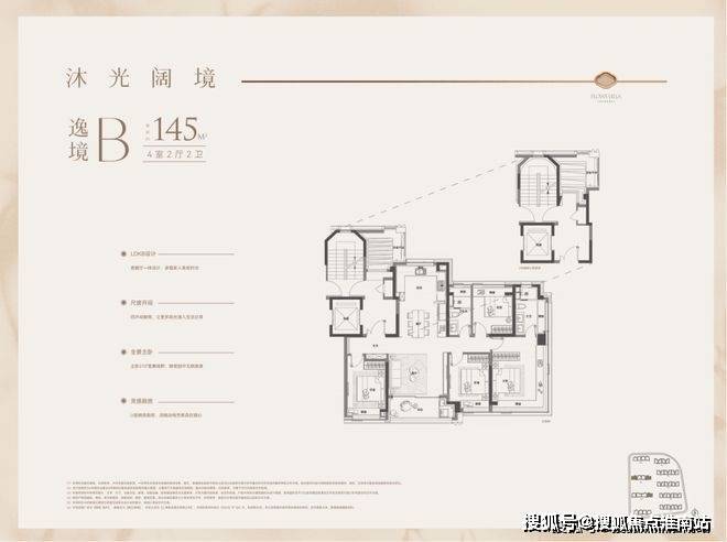 户型特点:4开间朝南,LDK一体化设计,南北通透。客厅面宽达4.3米,外接4.8米长阳台,采光通风俱佳。主卧带270°转角飘窗,主卫也有飘窗赠送。全屋飘窗设计,独立电梯厅,私密性与尊享感强。