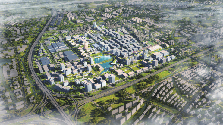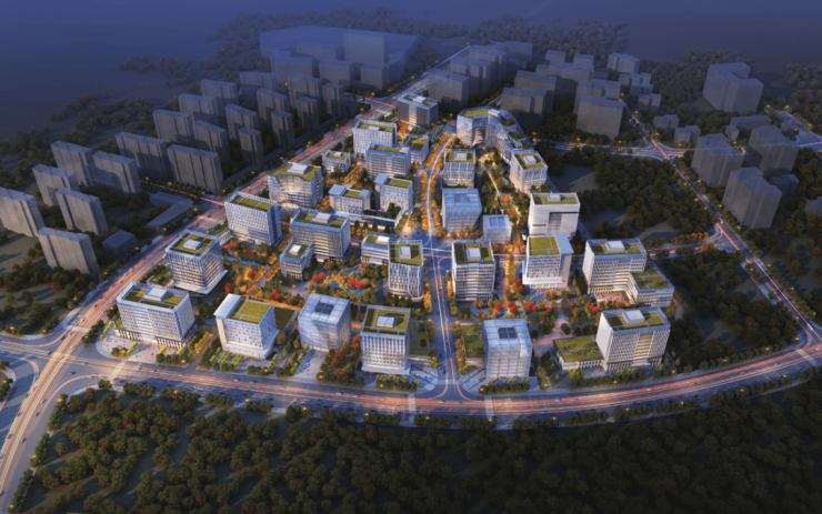 东区规划约1400亩土地,整体架构为“一核、一带、两轴、多组团”,聚焦商务研发功能。