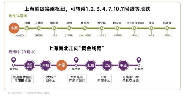 ● 双轨交汇:【地铁14号线——超级换乘枢纽 】步行约200米至地铁14号线封浜站,可与1、2、3、4、6、7、8、10、11、13、15、18号线等多条地铁线路实现换乘。【地铁嘉闵线(在建中)——南北走向“黄金走廊”】近地铁嘉闵线乐秀路站(在建中),约3站直达虹桥(以政府规划为准),加速链接虹桥商务区、七宝、莘庄等重要区域。● 近13号线金运路站——纵横城芯5大区 纵横普陀区、静安区、黄浦区,通达南京西路、淮海中路、新天地等地● 嘉闵高架——南北动脉