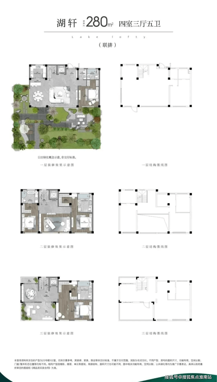 (1)联排:打造约246m²、约256m²(边户)、约280m²三个户型面积,以迭代的联排作品,致敬真别墅的回归