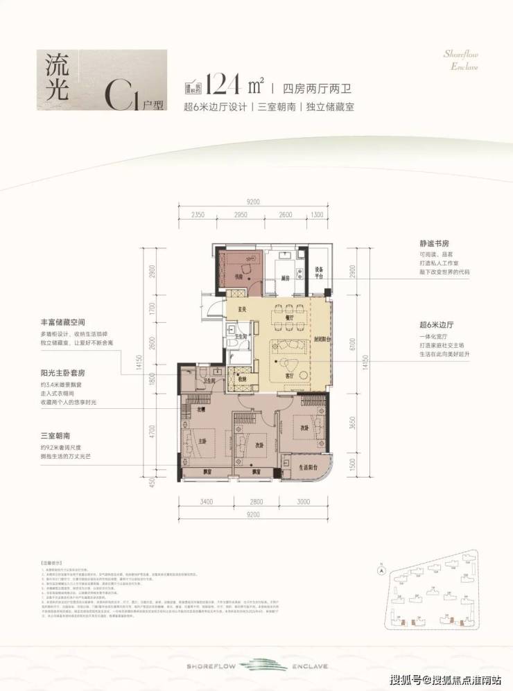 这款户型堪称四开间朝南的“流量王者”,南向面宽约13米,双联阳台+双飘窗设计,视野和采光优秀;套房主卧、双阳光次卧,颇有大平层的气势。