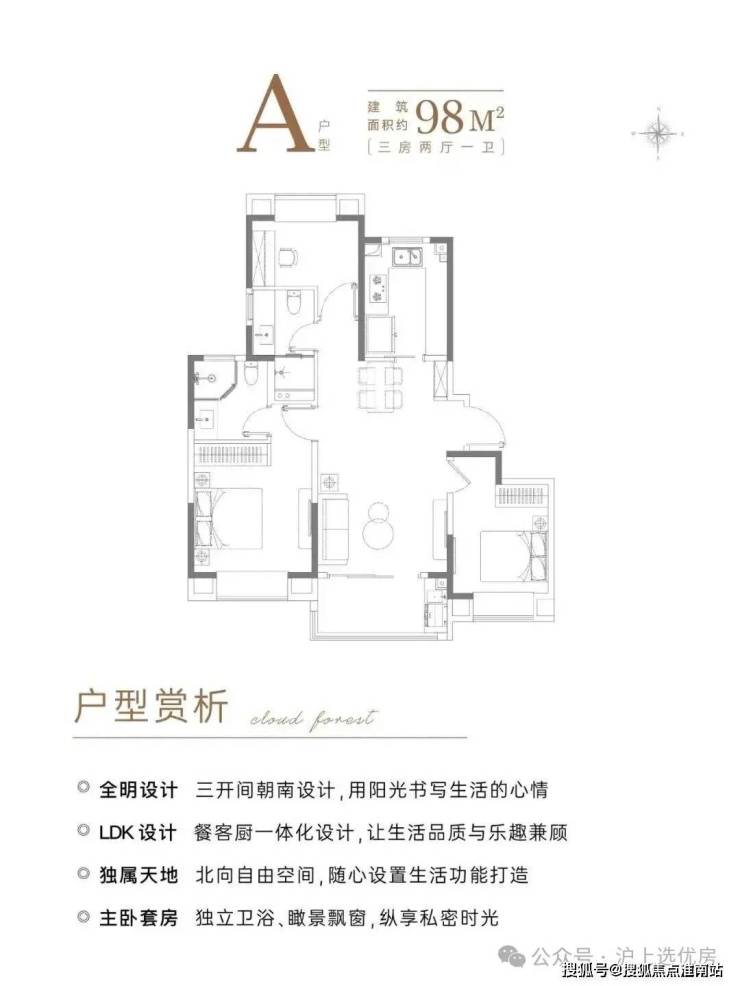 约98㎡3房2卫的爆款飞机户型,南北通透+三开间朝南,整体室内的采光、通风都做到了极致。