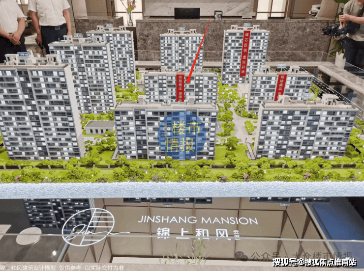 这是项目的沙盘模型,注意看下图箭头指的“楼王”位置,就是建面约132㎡的大平层户型所在的楼栋。