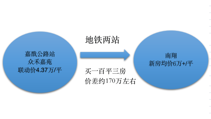 项目是2022年第二批次土拍的地块,房地联动价4.37万/平,一分未涨。往前两站的南翔,新房均价站上6万+,两站地铁,价差约1.7万/平,同样买百平米三房,能省下将近二百万左右!
