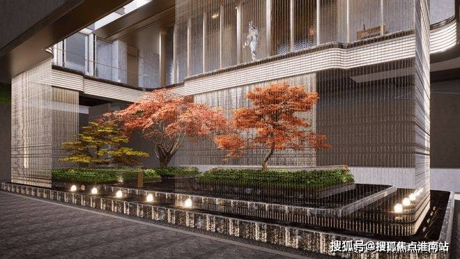 下沉庭院整体长约18米,进深约9.5米,庭院的上下景观通过水帘相连通,中间结合有着层层叠水的水景,搭配水晶砖的景墙,将品质感拉满。