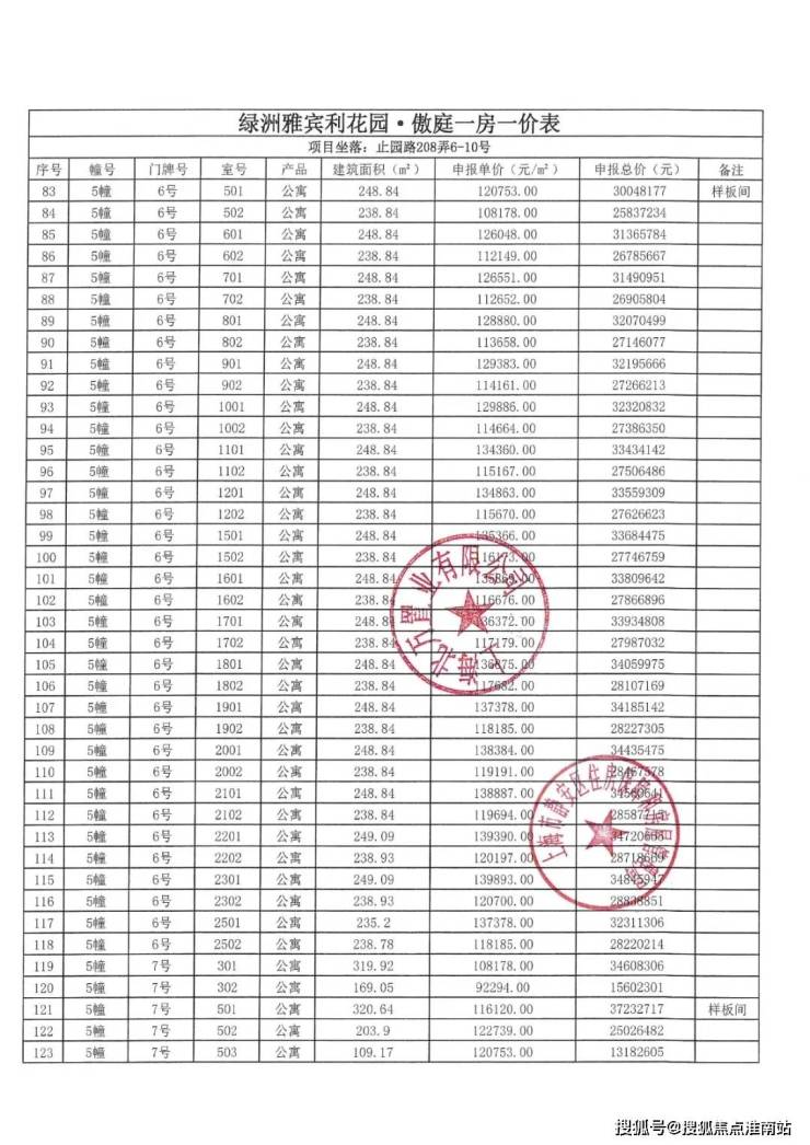 上期一房一价表如下: