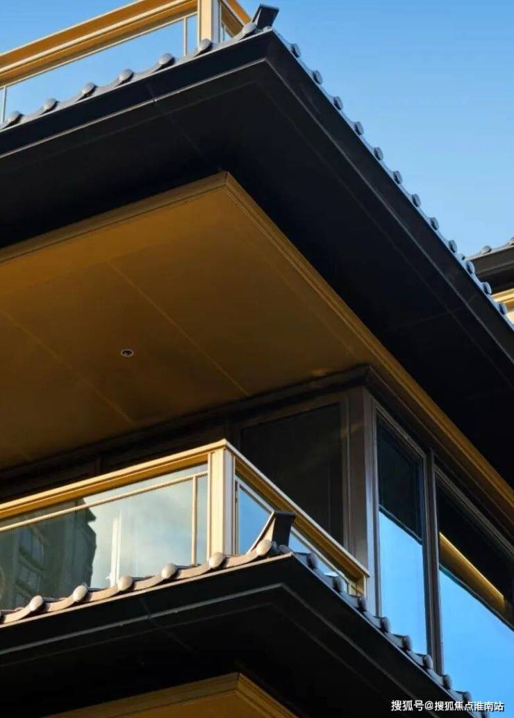 三重屋檐,代表天地人融合的东方宫殿最高等级,上檐、外檐、下檐三重结构,现代立面,以铝板、格栅、石材、瓦墙型材、玻璃等现代型材,彰显传世之宅的独特气度。