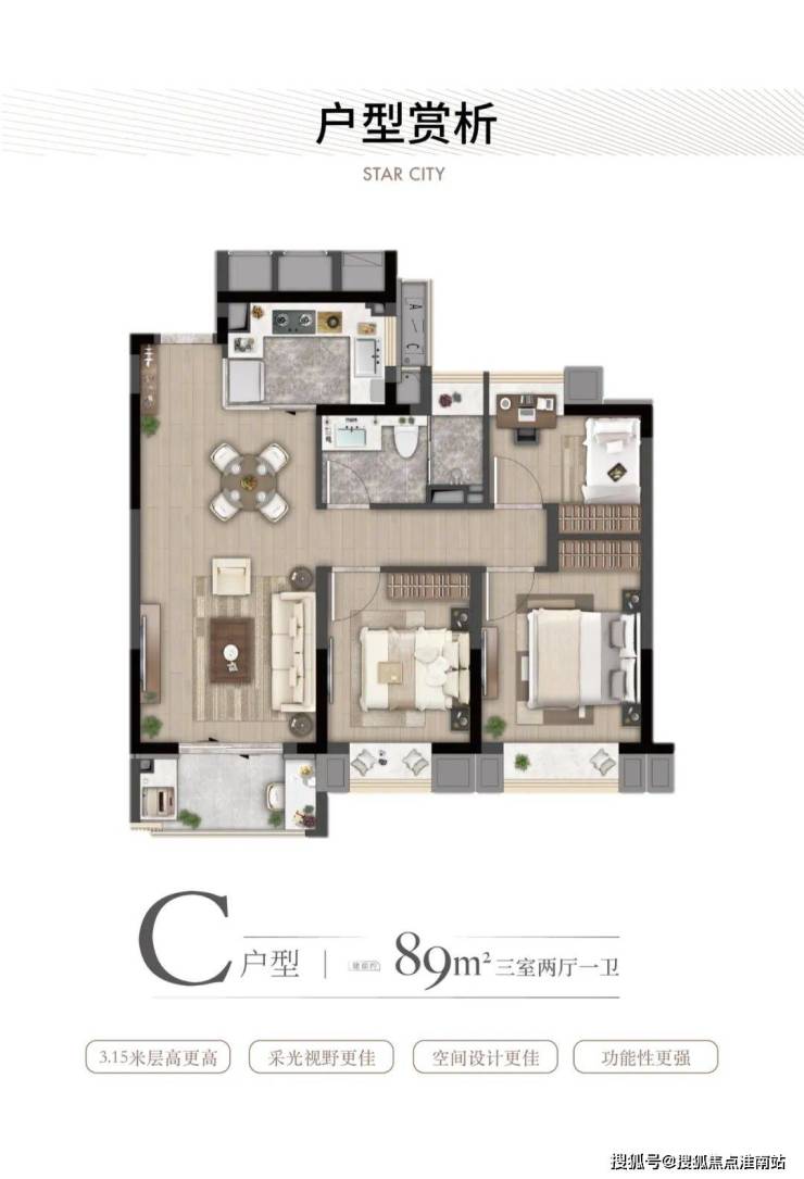· 约89㎡户型:大虹桥范围不到90㎡的户型大部分都只做到2房,灿耀星城该面积段实现 3房功能性,让自住客户一步到位,也让该产品进入二手市场后具备降维打击的优势!