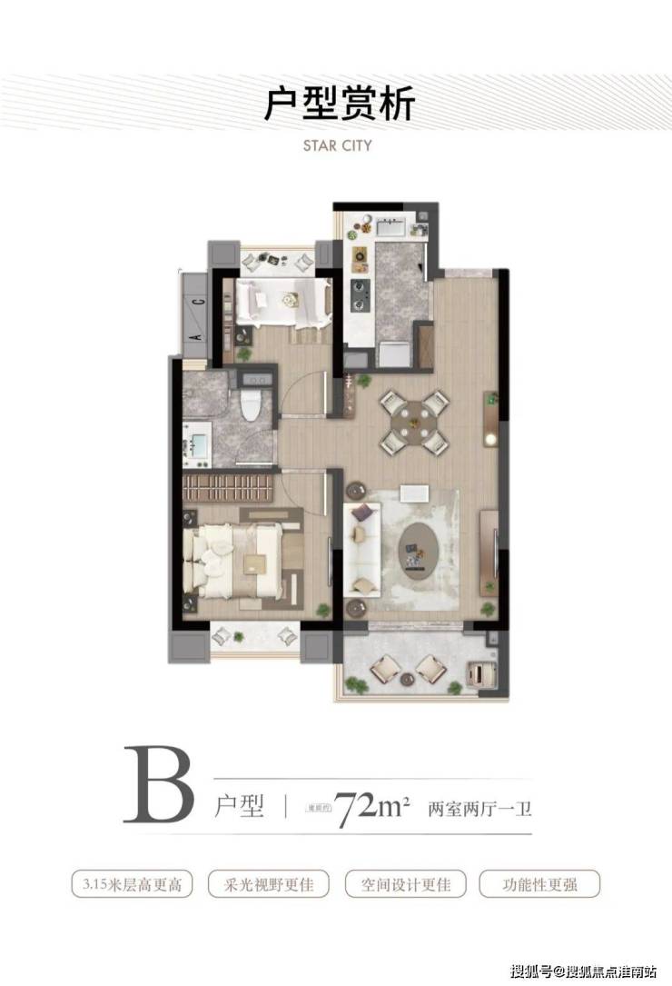 B户型 建面约72㎡两室两厅一卫▼