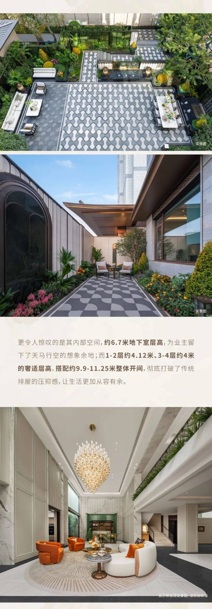 采用“王府中式”设计,大门为歇山顶形制(宽53米、高近11米),配黄铜狮、罗汉松及蓝翡翠奢石。园林融入西湖十景元素,如“花港观鱼”水景、“柳浪闻莺”绿植,并设雾森系统首层单元门厅石材铺就,肌理沉稳。