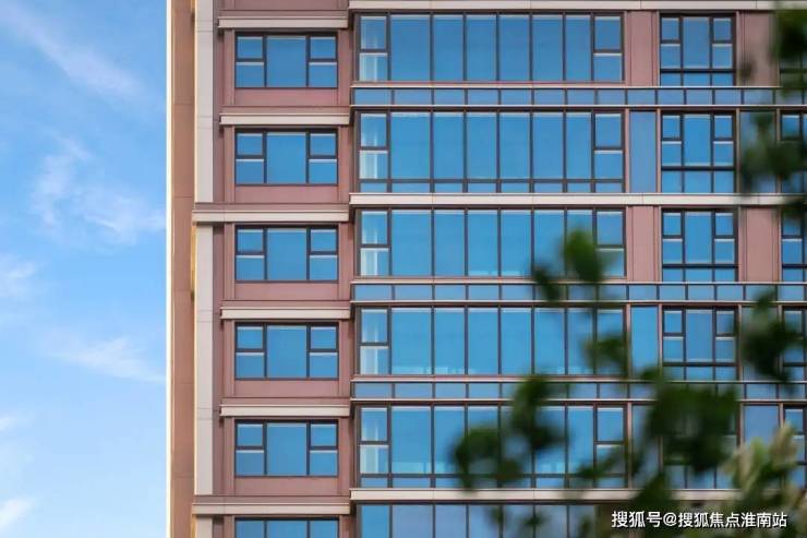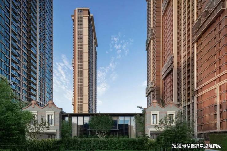 高层外立面是世贸金麻石材搭配香槟色/铜色铝板,营造出金属质感风格,尤其是铜色铝板与石库门红砖风格互为映衬。