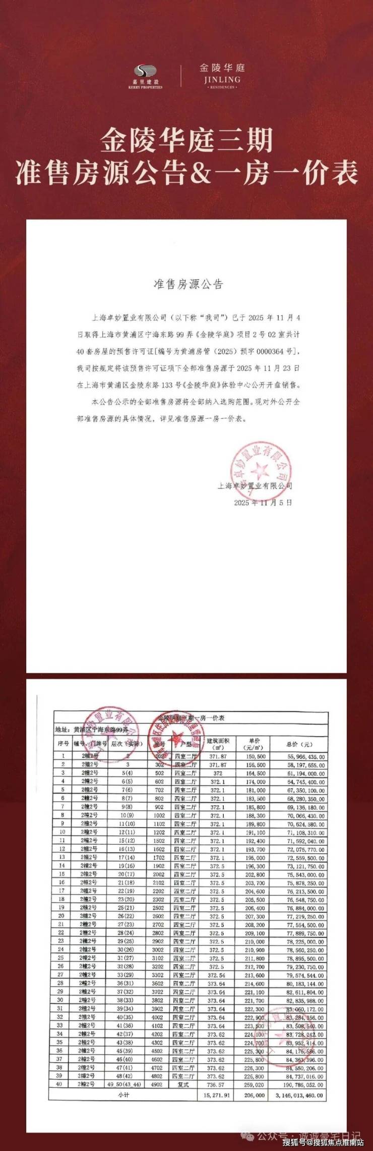 最新信息:黄浦区外滩街道核心豪宅项目【金陵华庭二期】最后批次加推,建面约370-730㎡大平层&复式,均价20.6万过会,2025年11月6日开启认购!