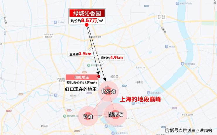 其次,项目距离预计约18万+的瑞虹地王直线约3.9km、距离北外滩直线约4.9km,几乎就是一脚油门就能抵达的存在。