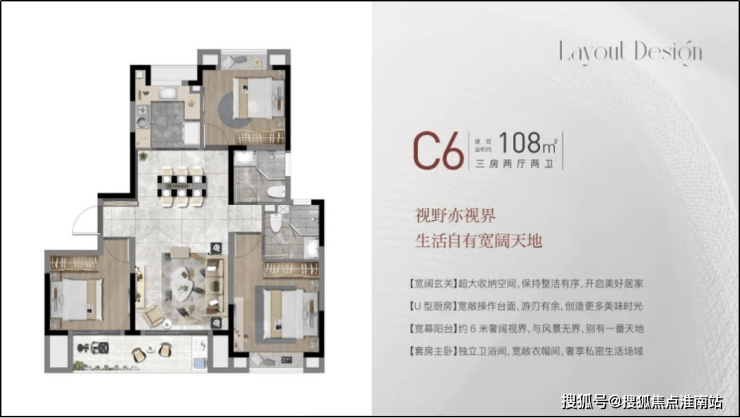 建面约108㎡3房2厅2卫,做到了三开间朝南+双阳台设计+主卧套房设计+南北通透,该户型得房率非常高。