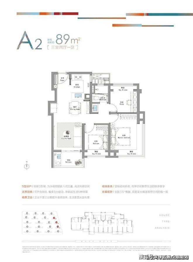 建面约89㎡3房户型:东边套主卧配置约270°双向采光飘窗、S墙设计,主力总价仅约450万级,首付约90万起!