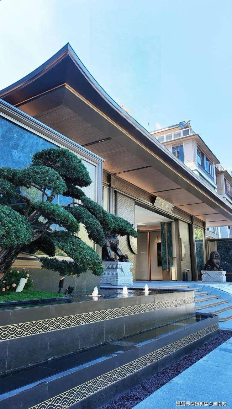 小区大门为歇山顶大门,形制媲美故宫乾清门,宽约53米(含景墙)、高近11米,鸱尾微翘,门两侧各置一块价值百万的蓝翡翠奢石,匹配高约2米(含基座)、重约600斤铜狮镇宅,搭配罗汉松迎客造型树,高定气场扑面而来,再设七级台阶,寓意步步高升,仪式感十足,中式的尊贵感从归家开始就把情绪拉满。