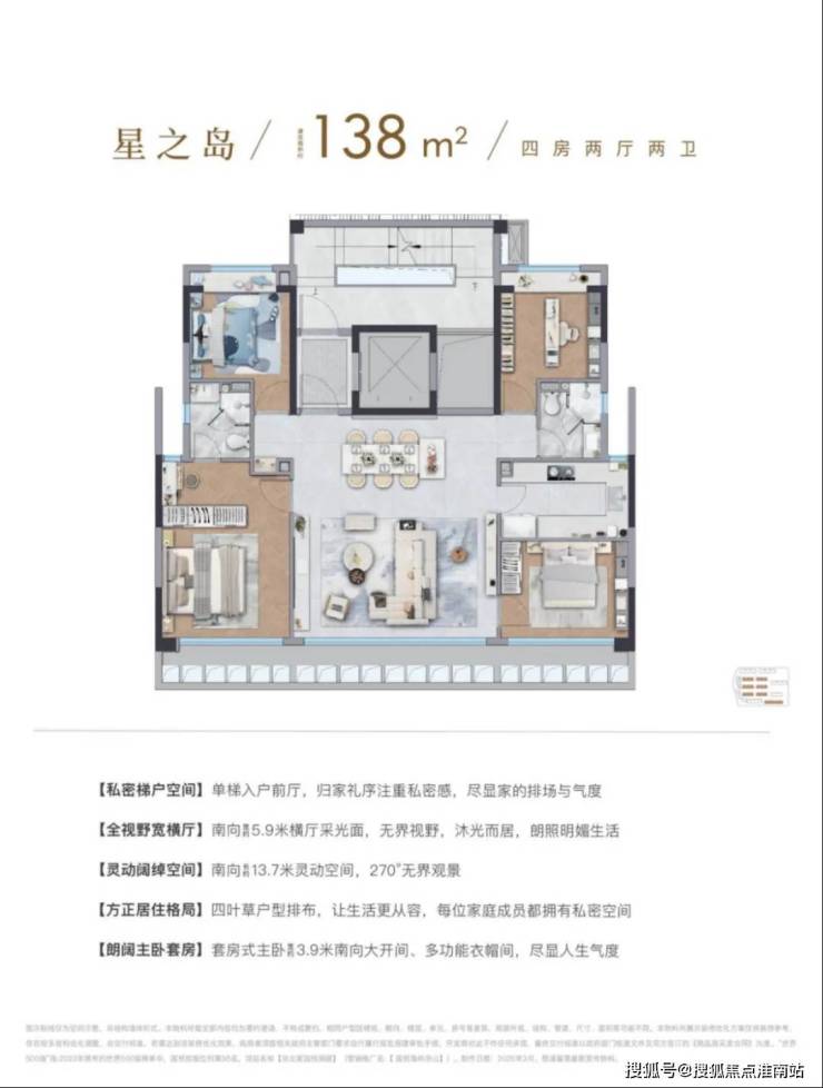 这个四房虽然建面只有138㎡,但因为是5层叠墅的高得房率,以及室内空间的高效利用,其功能和尺度感,给人的感觉十分惊艳。