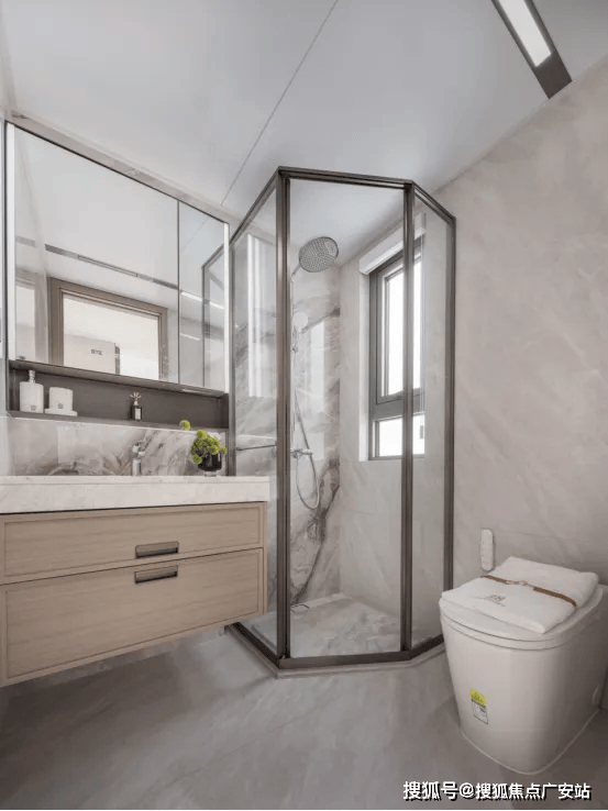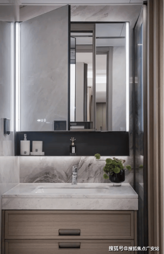家的巨量收纳卫浴:主卫生间配备了智能化的魔镜,该镜面为双面高清设计,内置美妆冰箱功能的镜柜以及卫浴柜,能够实现恒温冷藏。主墙面装饰采用了耐用的岩板材料,内部设计考虑周到,特别预留了四个电源插座,方便电动牙刷、卷发棒以及吹风机等个人护理电器的使用和收纳,同时设有洗脸巾的抽取装置。
