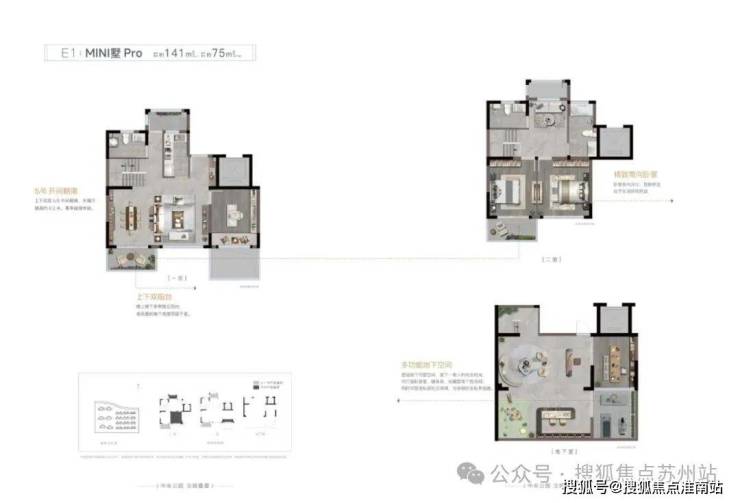 叠加141㎡户型图:(四室两厅四卫)中上叠没有地下室 ,下叠141+75平(地下室)