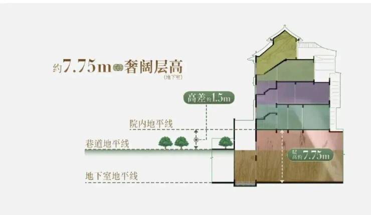 一重创新:约1.5米整体抬升设计。 传统排屋,巷道内就能看见院子,私密性欠佳。云启玉渚将排屋区整体抬升,形成天然围合屏障,从此“巷道不见院”——你在院里喝茶、莳花,不用担心路人目光。同时,地下室抬高后,采光和防潮性能大幅提升。