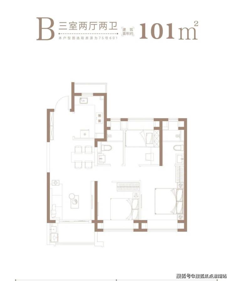 1、约101㎡均为3房2厅2卫,A、B户型分别是边套、中间套,满足不同人群的居住需求。