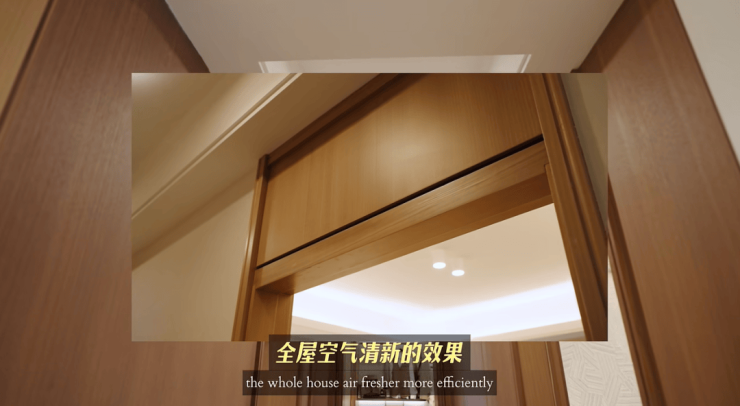 而为什么卧室的门又没有做到通高呢?仔细看一下,每个卧室门头都是一个新风出口,这也就能更高效地达到全屋空气清新的效果。这就是吴风宸樾府在细节上[花]的[心思]。