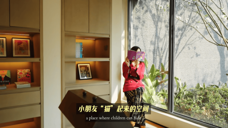 采用同样手法的还有架空层。落地玻璃突破梁柱的限制,形成了完整的外立面;甚至在转角处做出了270度的视野,还顺便创造了一个小朋友“猫”起来的空间。