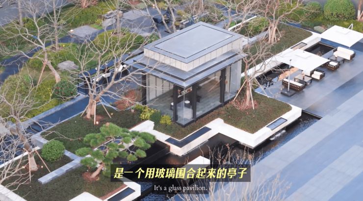 继续往里走,就是一轴八境的园林景观。13种天然石材、12类园艺树种,以及溪流、叠水、涌泉等水景之外,我最喜欢的,是一个用玻璃围合起来的亭子。