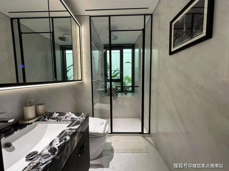 ✔卫生间地面和墙面整体性也非常强,奢石台面的纹路和岩板墙面和协调。