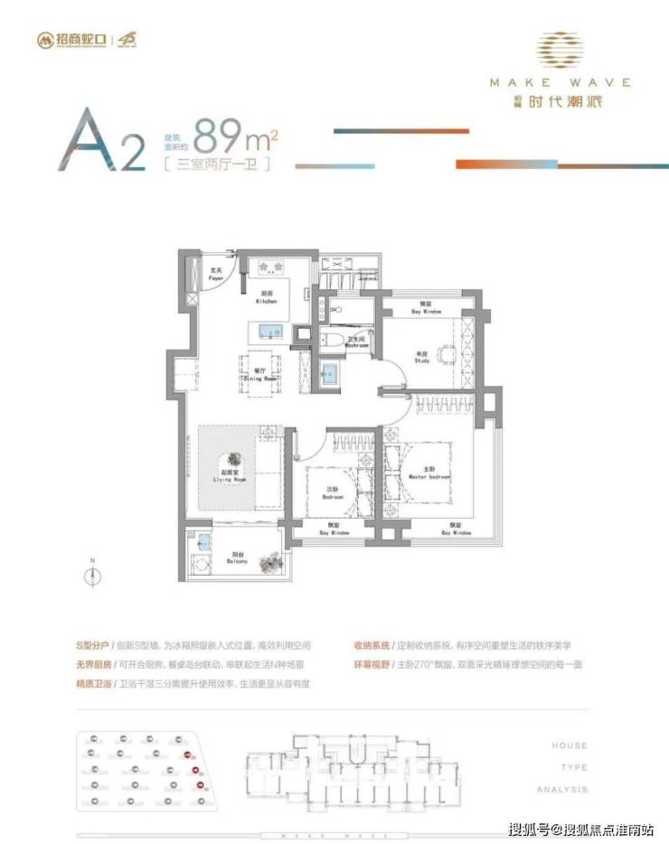 建面约89㎡3房户型: 东边套主卧配置约270°双向采光飘窗、S墙设计,主力总价仅约450万级,首付约90万起!