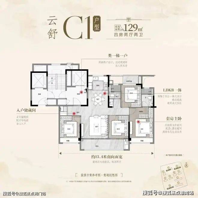 建筑面积约129平方米的四房户型也毫不逊色。玄关处有一个日式800库设计的储藏间,这个空间简直是杂物消失术,现在的都市人十分需要。