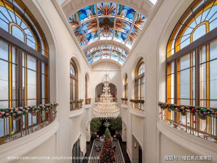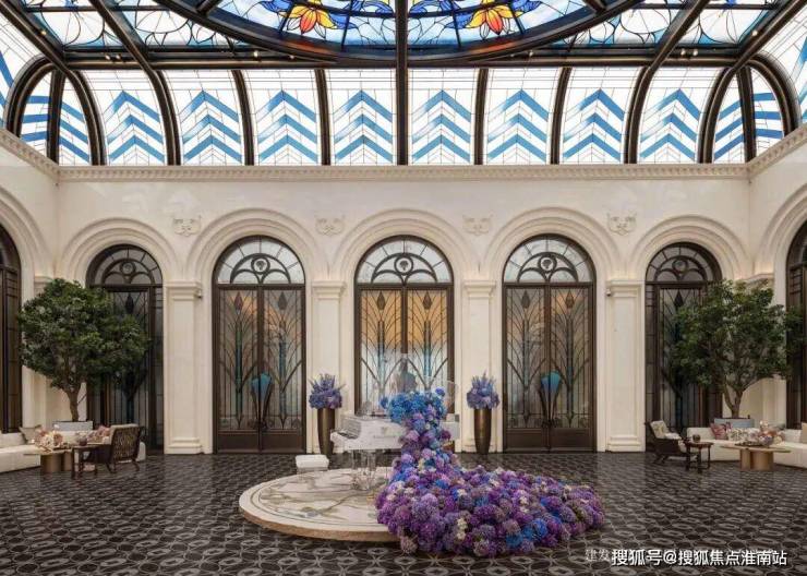 「华亭烟雨」造设波光喷泉与孔雀雕塑,八株紫玉兰盛绽其间,将自然之力凝聚为艺术语言;「千步廊」汲取和平饭店的设计灵感,地面通铺同款“金珠算盘”,并融入绒绣、顾绣、海派玉雕等“上海非遗十绝”,将海派东方的摩登风韵尽致演绎;「孔雀厅」同源上海华尔道夫酒店精髓,约14米挑高宏阔大堂,开阔奢华,穹顶巨幕彩绘玻璃,历经团队三轮打样,终成绮丽之景。