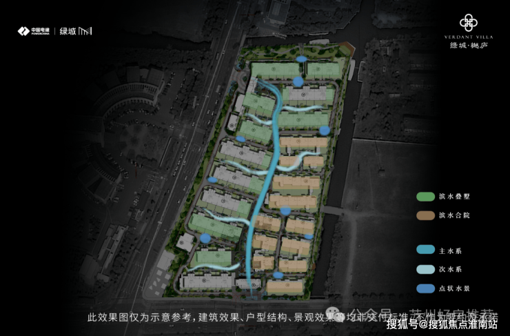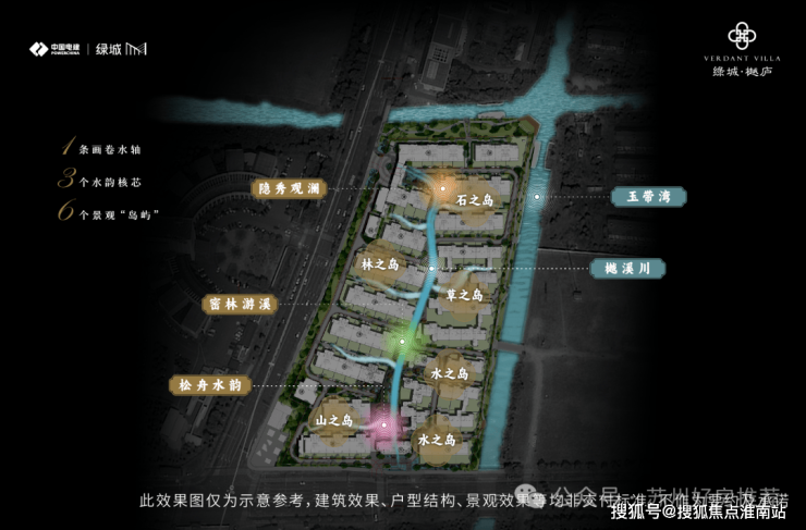 绿城·樾庐外部打造约500米长水岸绿带「玉带湾」,呈现可漫步、可停驻、可社交的诗意栖居场域。内部以一条水轴「樾溪川」构筑当代园林系统,并划分两大业态组团,同时以支脉水系分割,形成岛屿化组团,在水境空间中勾勒流动的静谧体验。