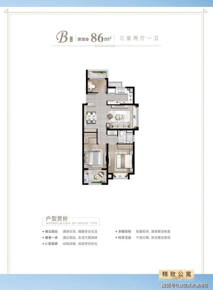 ①86平(三室两厅一卫) 边套户型,三面采光