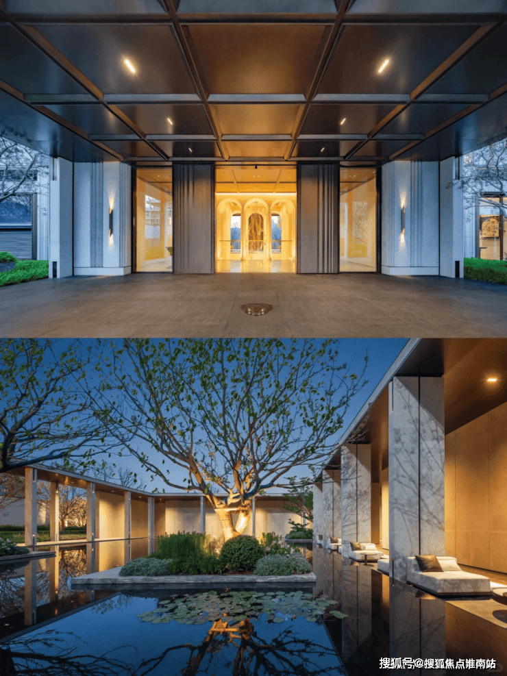 大门以非遗杭扇为灵感,偏中式,穿过门庭就是公区水院和会客厅。