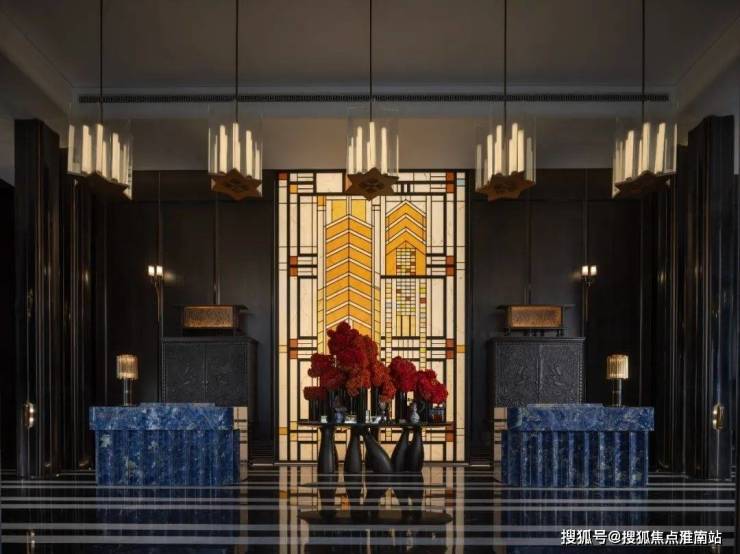 另外,项目在材质上大量运用奢石。比如项目的门楼采用了上海海鸥丽晶酒店同款巴西金石材。接待大厅采用进口奢石巴西乌金石打造的大理石柱。接待台则采用玻利维亚蓝,这是世界上储存量极少的石材之一,被称为奢石中的劳斯莱斯。随处可见Old money奢华风格。