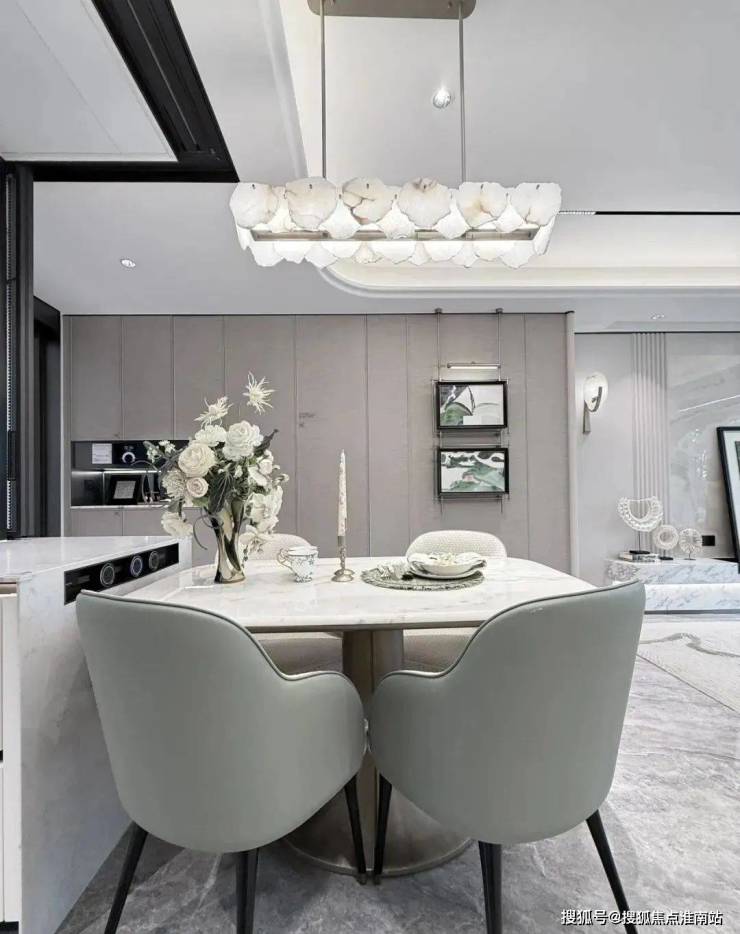 首先厨房是半开放式的岛台,让整个公区的视野更开阔,尺度更具豪宅气度。其次敞开式的厨房能让家人沟通更顺畅,温馨感提升。最后,厨房的选品也是坚持使用主义,采购了方太的市售款,隐形油烟机颜值非常高,灶具和蒸烤箱则做了完全的联动。