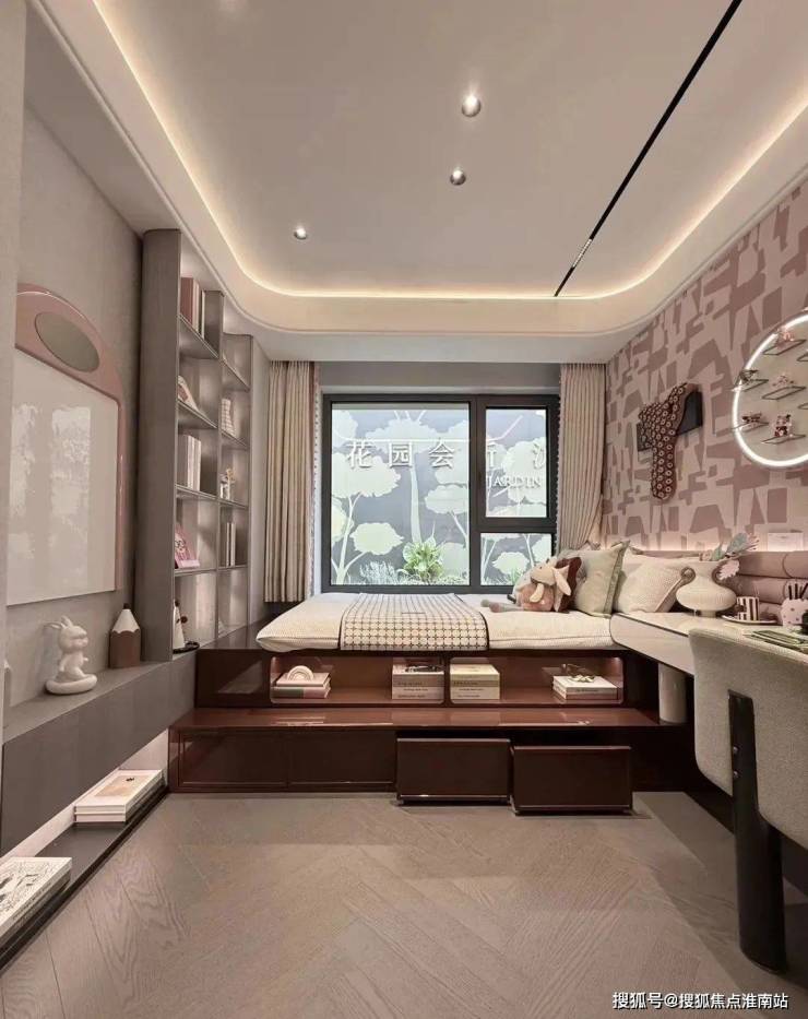 北向卧室的S墙设计,则可以做成 一整面的收纳架,书籍或玩具都有了足够的盛放空间。