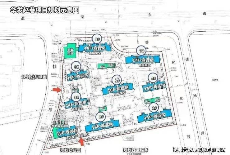 根据设计方案显示,项目拟建9幢14-18F住宅及配套设施,项目非人车分流,部分楼栋首层有架空,东面有河道经过,南面规划了一处幼儿园用地。