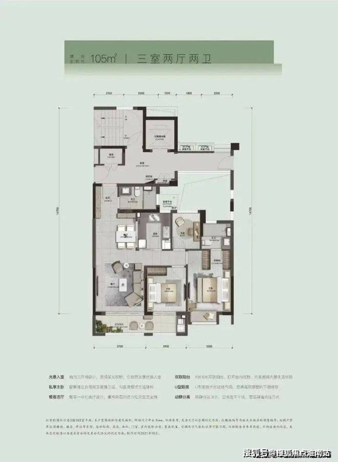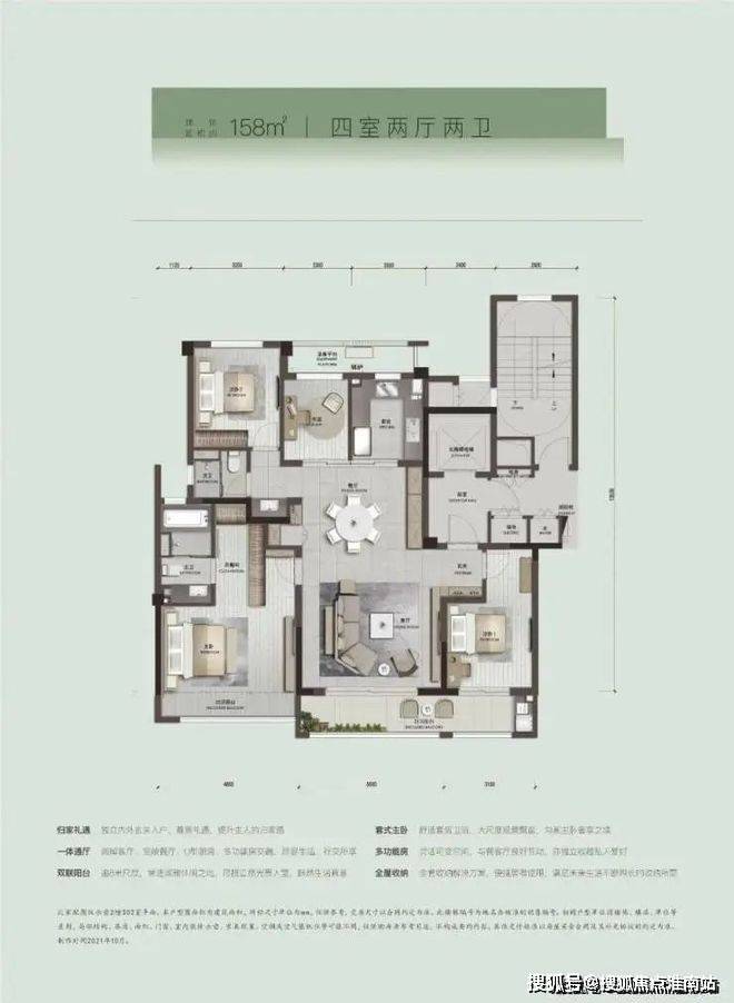 四开间朝南、全明结构、13.6 米南向面宽,让客厅、阳台与卧室尽可能全部南向排布成为第一设计原则,不仅保证居家大部分时间充分享受清风、阳光与风景,更让每一个家庭成员平等享受家与自然的交互;约7.1米连体大阳台奢阔格局,以GAME、GROUP、GARDEN、GALLERY、GYM作为主要功能,可以是孩子的游乐场,奶奶的小花园,爷爷钟爱的风景画廊,妈妈的闺蜜趴,爸爸的图书馆。一方空间的高度利用化,也形成家庭温馨的美好场景。